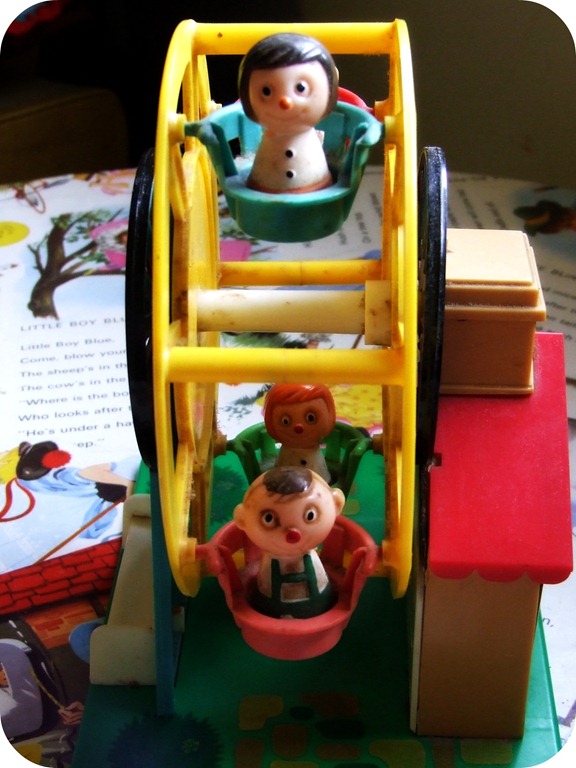 Nothing, nada, zip. Ugly, naked dolls, boring soft toys & copious amounts of tacky plastic junk. I turned to leave when something altogether different caught my eye; a Ferris wheel. An old, dusty, entirely adorable vintage toy Ferris wheel. Of course I grabbed it like I was a drowning sailor grabbing for a bobbing life preserver, but even as I did I was thinking “God, this is going to be expensive…”. $2.